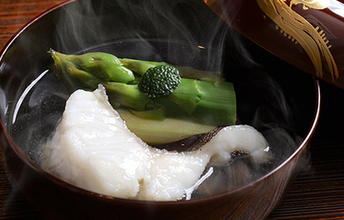 天然の羅臼昆布の旨みと、枕崎の本枯節の香りが効いた、当店自慢のお出汁を使ったお椀もの。季節の椀種と共にご賞味ください。
